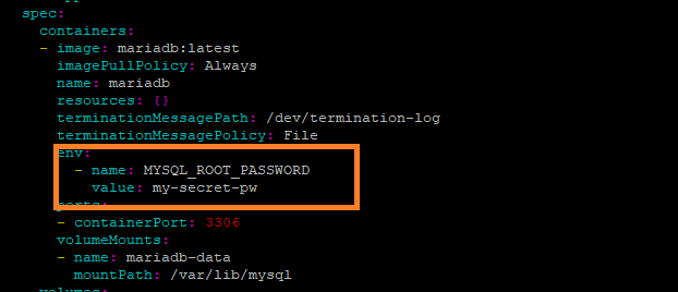 Pour référencer l’objet ConfigMap mariadb et l’objet Secret mariadb, la déclaration du champ envFrom prendra la forme suivante :